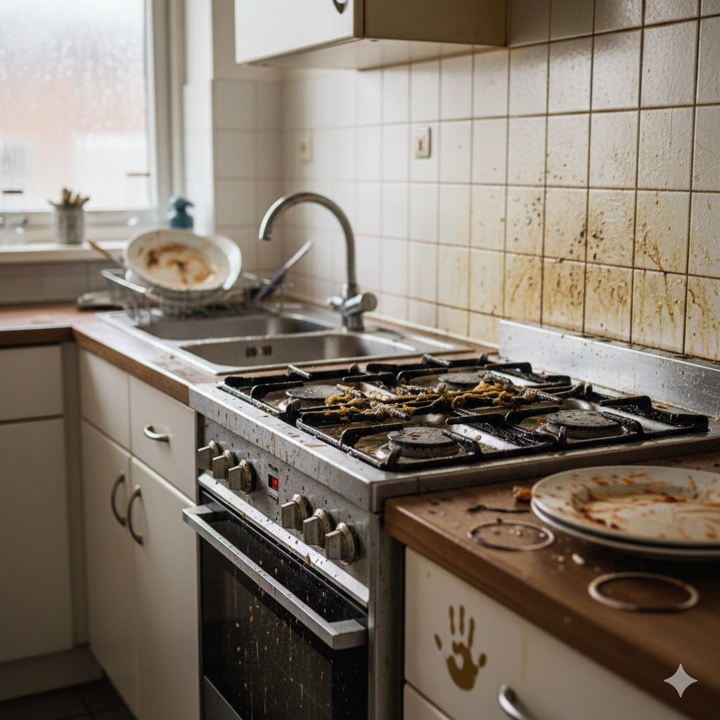 落とすためのコツ:冷たい油はかたまりやすく落ちにくいです。アルカリ性洗剤をお湯で溶かすか、汚れを蒸しタオルで温めてから吹き付けると、油が緩んでサッと拭き取れるようになります。